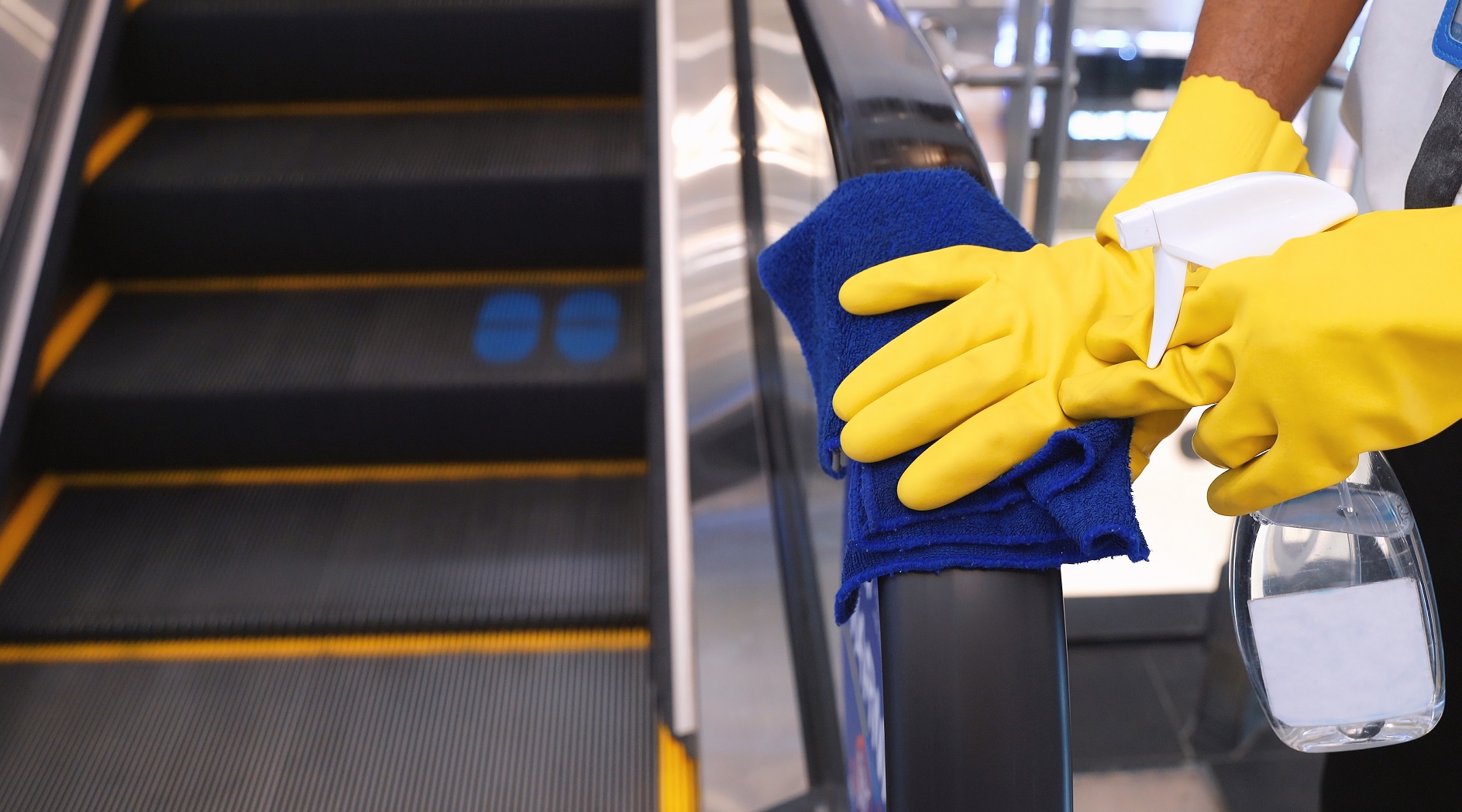 Staff cleaning the escalator hand rail in department store to prevent the spread of pandemic Covid-19 and Coronavirus, healthcare and hygiene concept
