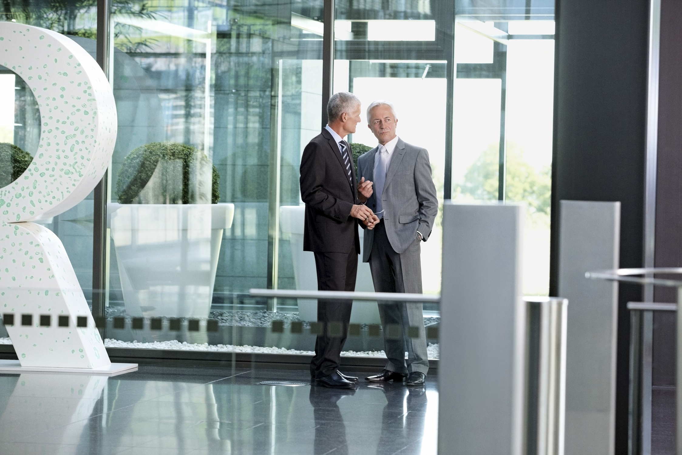 Two businessmen talking in office lobby